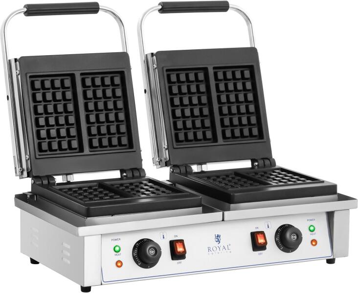 Belga stílusú forró finomságok a dupla gofrisütővel Friss és ropogós gofrik gyorsan és egyszerűen! A royal_catering RC-WM201 gofrisütővel ropogós, aranybarnára sült belga stílusú gofrit varázsolhat vendégei elé, miközben a frissen sült gofri ínycsiklandó illata lengi körül kávézóját vagy éttermét. Akár édes változatban, csokoládéval és bogyósgyümölccsel, akár kiadós sós fogásként, sonkával és friss fűszerekkel – a sütőeszközzel pillanatok alatt ízletes és változatos, 170 x 100 mm-es gofrikülönlegességeket szolgálhat fel. A royal_catering kínálatában minden vásári kelléket megtalál, amire szüksége lehet! professzionális – a dupla gofrisütő ideális éttermekbe, büfékbe, kávézókba és karácsonyi vásárokra gyors – a 2 x 2000 W-os teljesítménynek köszönhetően egyszerű – teljesen automatikus termosztát 50–300 °C hőmérséklet-tartományban biztonságos – szigetelt fogantyúk és csúszásmentes gumilábak a biztonságos használat érdekében tartós – az öntöttvasból készült sütőlapnak köszönhetően